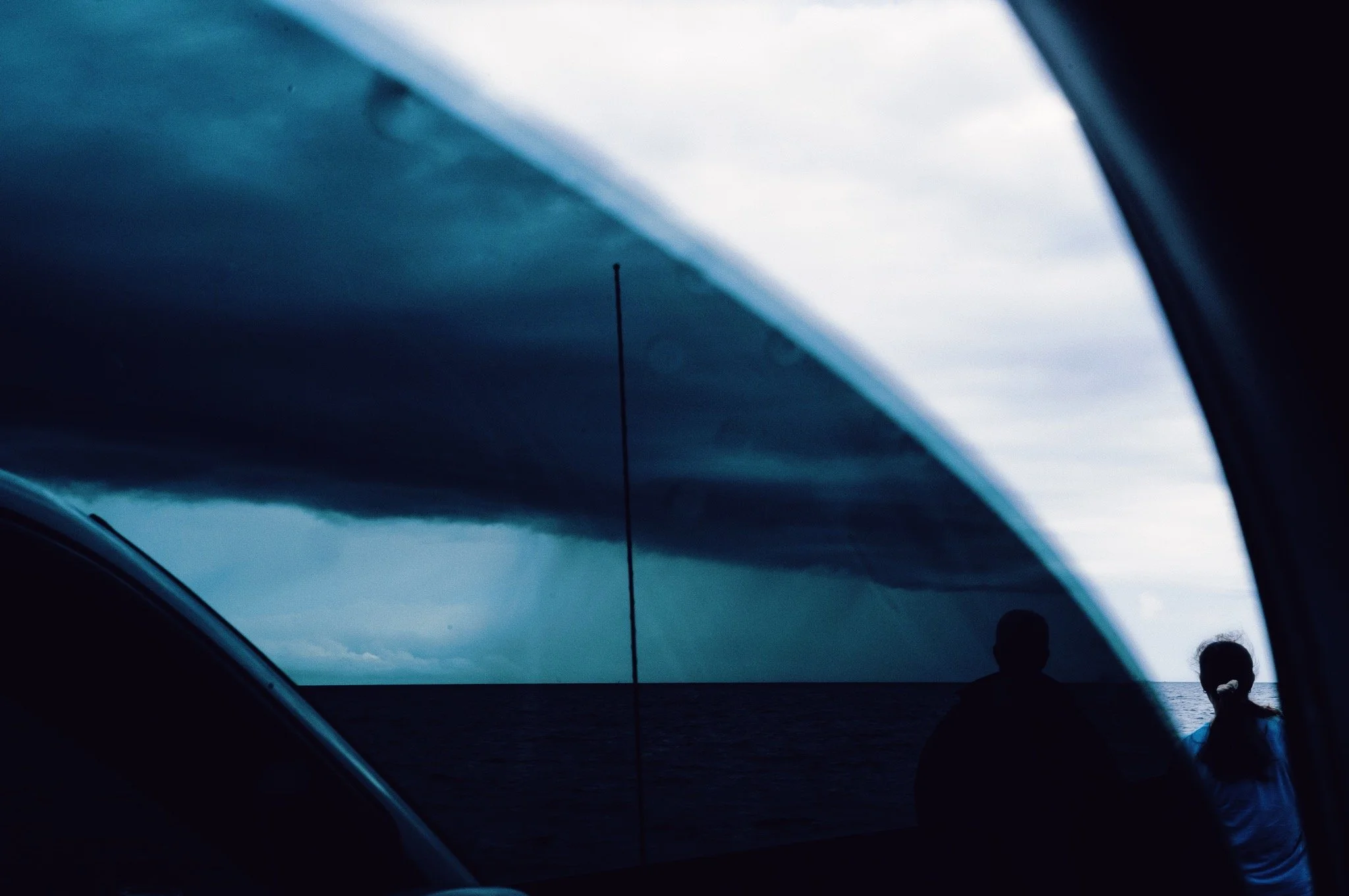 My ass found the exact chair that was used so many years prior, and my eyes drifted past the glass and railings to the infinite horizon beyond. And the moment I sat, it was there again. That same splinter of light. The same cut across the glass that had framed my sister years ago, back when the family still moved as one body. The chair itself became a trigger, pulling me straight through the years without my permission. Light doesn’t ask permission when it folds time. It dragged me back the instant I touched that seat, collapsing years into a single breath. Lashes on the roof and floor of my eyelids were motionless as the horizon began to glow. My body froze and past the water drops and windows and passengers taking selfies, was a return. The same eggshell of cumulonimbus from a decade before started to bleed out the mixed grays and drizzles of rain. Tiffany blue skies peeked behind it all, and recollections of my sister’s hair bouncing as she laughed with my mom and walked past the seat tinged my fingertips with a bit of cold. The blood finding its way to the core of my chest as a smile formed. I could feel the same joy again from making that picture. Shock and amazement and everything wonderful.